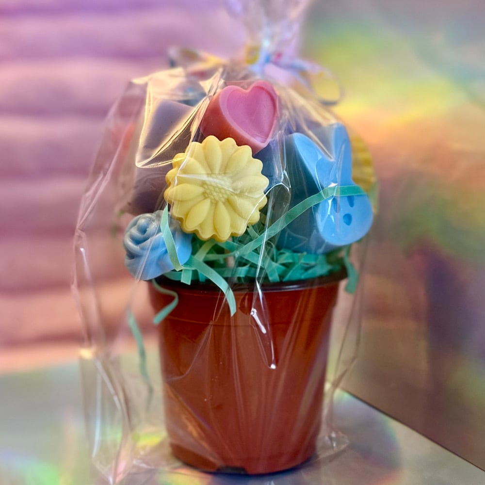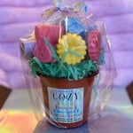 Each Wax Melt Bouquet includes an assortment of 12 deliciously fragrant Easter-themed wax melts on skewers. All packaged together in a plastic flower pot with Easter grass, and tied up in a cellophane bag with a cute ribbon. To use, just pop the wax off of the wooden skewer before placing it in your warmer.